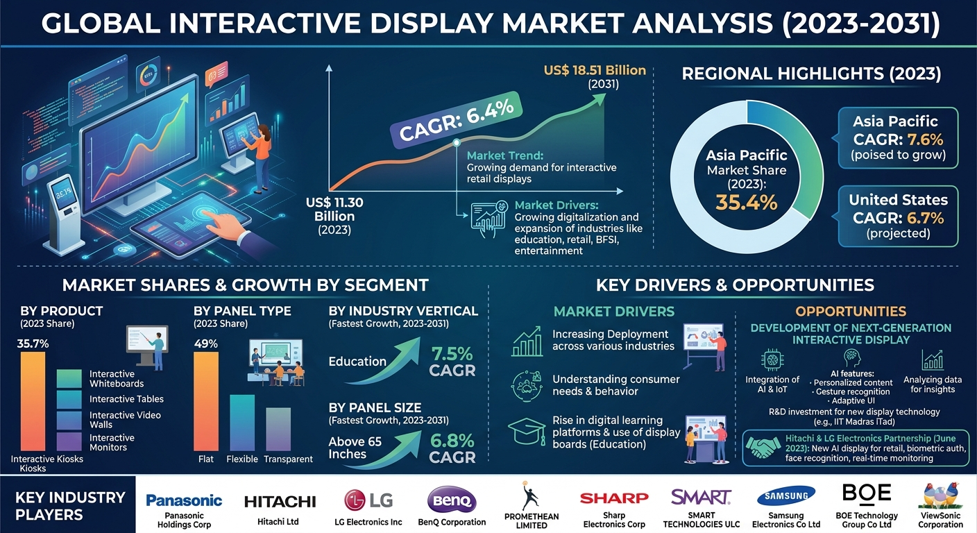 The Interactive Display Market Trends is experiencing steady growth as enterprises and institutions adopt advanced display solutions to support collaboration and digital learning environments. The market size was valued at US$ 11.30 billion in 2023 and is projected to reach US$ 18.51 billion by 2031, expanding at a CAGR of 6.4% during 2023–2031. Increasing adoption of smart classroom solutions, corporate collaboration technologies, and interactive customer engagement platforms is significantly contributing to the growth of the industry. As organizations continue focusing on improving communication efficiency and enhancing digital experiences, interactive display technologies are becoming essential tools in modern workplaces and educational settings.