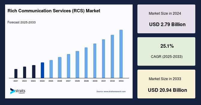 According to StraitsResearch, the global rich communication services market size was valued at USD 2.79 billion in 2024 and is estimated to reach USD 20.94 billion by 2033, growing at a CAGR of 25.1% during 2025-2033.