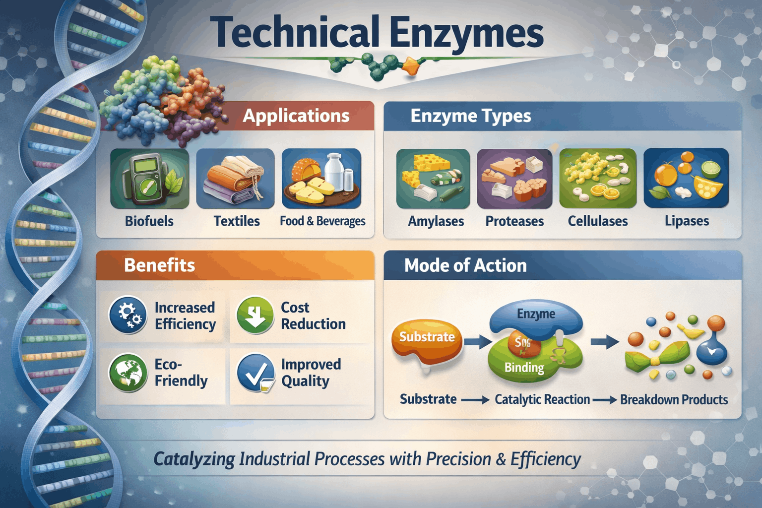Biofuel production scaling under national renewable fuel mandates in North America, Europe, and Asia Pacific is adding substantial volume-driven demand to total technical enzymes market size. Amylase and cellulase enzyme consumption in ethanol and advanced biofuel production is directly linked to total biofuel output volumes, and as global biofuel production capacity scales to meet policy-mandated renewable fuel blend requirements, the associated enzyme procurement volumes scale proportionately.
