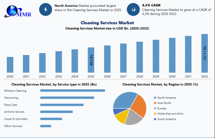 North America leads the cleaning services market due to strict hygiene regulations and high adoption of professional cleaning services.