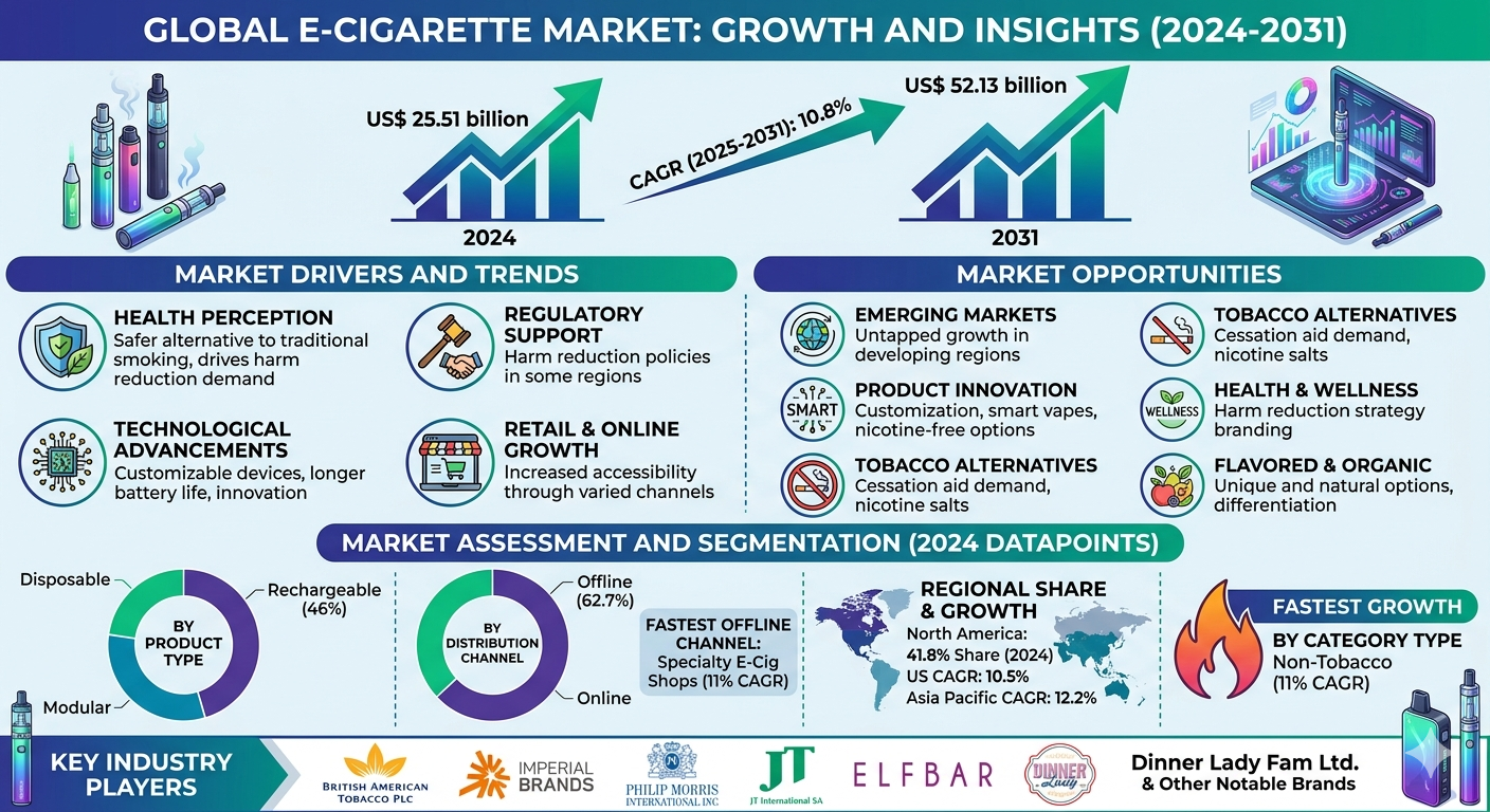 The E-Cigarette Market Trends is expected to experience significant growth in the coming years. The market size is projected to increase from US$ 25.51 billion in 2024 to US$ 52.13 billion by 2031, registering a CAGR of 10.8% during the forecast period from 2025 to 2031. The growth is driven by increasing consumer awareness about alternative nicotine delivery systems, expanding availability of vaping devices, and continuous innovation by manufacturers. Furthermore, the rising popularity of flavored e-liquids and modern vaping technologies is expected to support steady expansion throughout the forecast period.