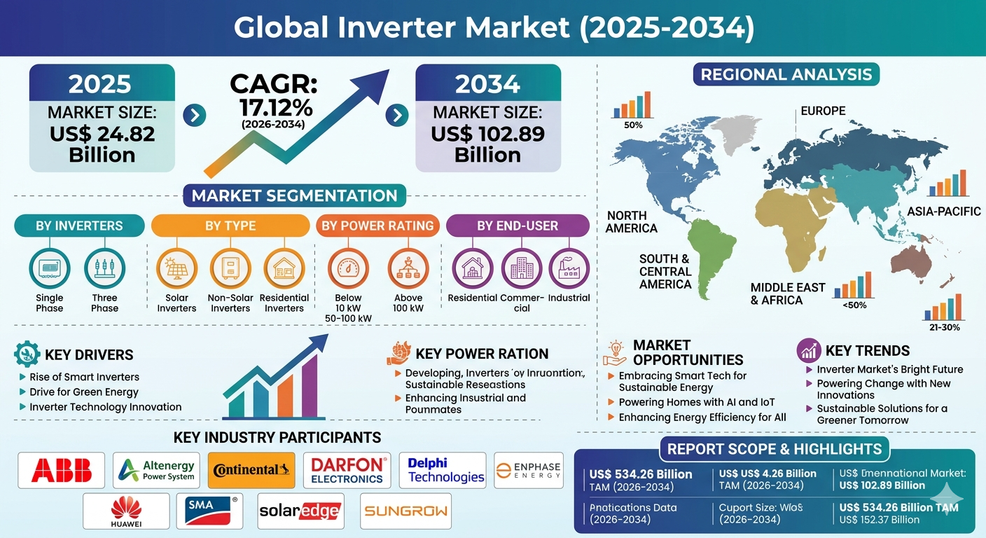 Within this evolving energy ecosystem, the Inverter Market Insights is experiencing significant global growth as renewable energy systems, electric mobility solutions, and energy storage technologies continue to expand. The industry is projected to grow from US$ 24.82 billion in 2025 to US$ 102.89 billion by 2034, registering a strong CAGR of 17.12% during the forecast period from 2026 to 2034. Inverters are essential components in modern electrical infrastructure because they convert direct current generated from renewable sources or stored in batteries into alternating current that powers electrical appliances, industrial equipment, and grid networks. Their increasing adoption across solar energy installations, backup power systems, and electric vehicles is driving strong industry expansion.