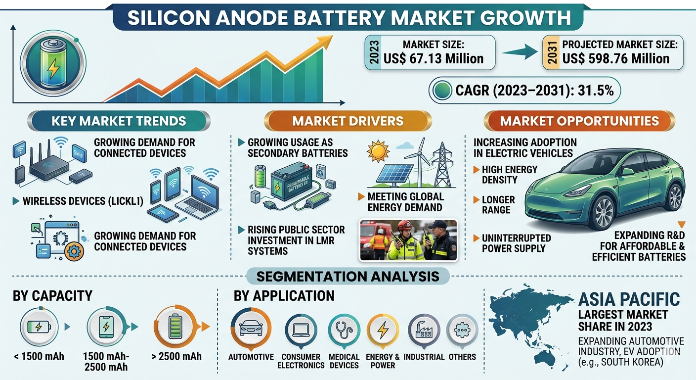 The Silicon Anode Battery Market Outlook is gaining significant momentum as industries increasingly invest in next-generation battery materials capable of supporting high-performance energy storage systems. The silicon anode battery market size is projected to reach US$ 598.76 million by 2031 from US$ 67.13 million in 2023, registering a CAGR of 31.5% during 2023–2031. In the center of this rapid expansion, the growing demand for advanced battery technologies across electric vehicles, consumer electronics, and renewable energy storage applications is playing a critical role in accelerating the adoption of silicon anode materials. Continuous advancements in battery engineering and material science are further encouraging manufacturers to develop innovative energy storage solutions.